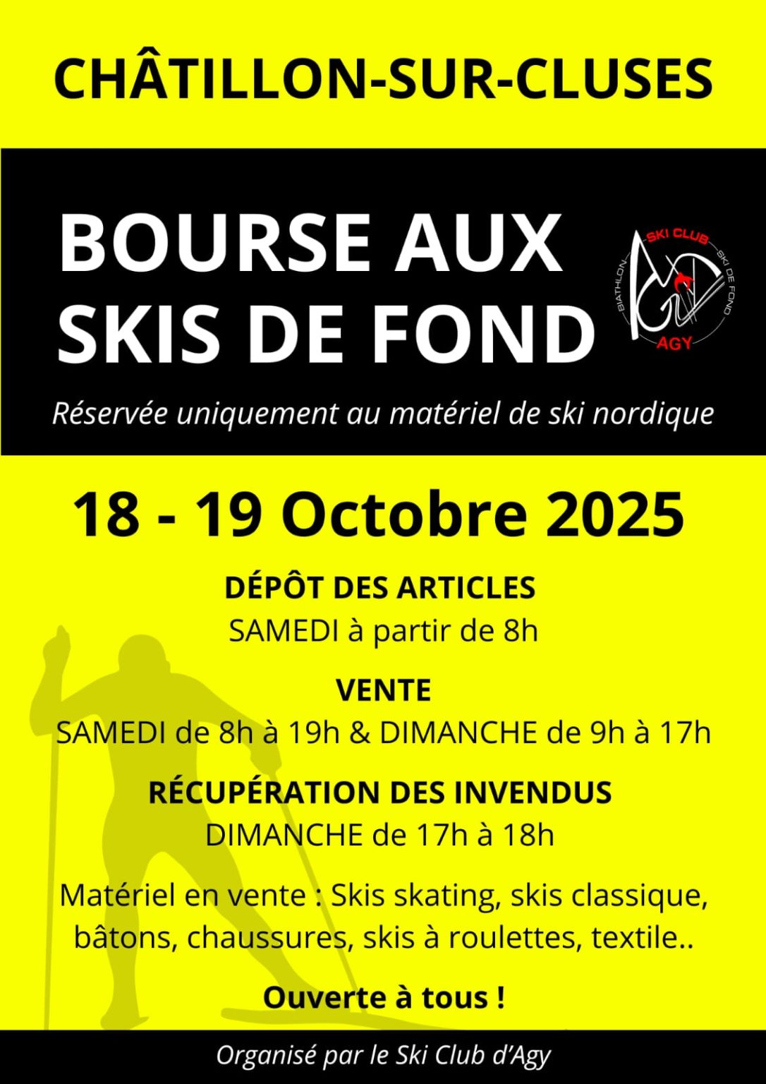 Comme chaque automne le Ski-Club d’Agy organise sa bourse aux skis, c’est le rendez-vous idéal pour s’équiper et faire des bonnes affaires avant la saison. Vous trouverez une offre complète de matériel classique et skating, des skis, chaussures, bâtons et vêtements. Vous pouvez également déposer votre matériel à la vente. Buvette sur place.
