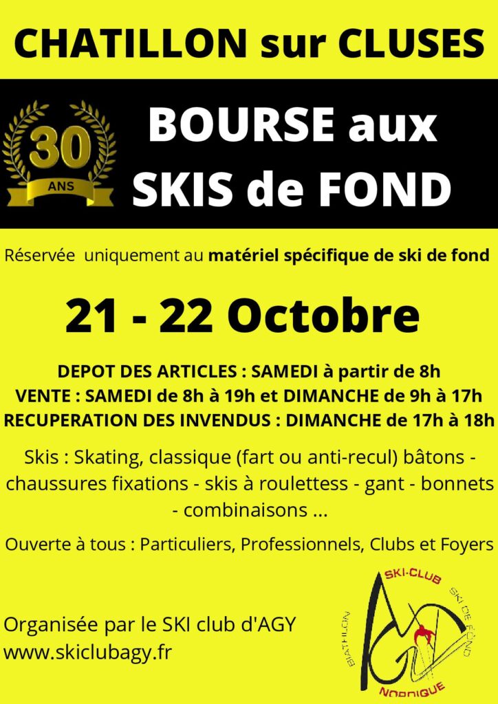 Comme chaque automne le Ski-Club d’Agy organise sa bourse aux skis, c’est le rendez-vous idéal pour s’équiper et faire des bonnes affaires avant la saison. Vous trouverez une offre complète de matériel classique et skating, des skis, chaussures, bâtons et vêtements. Vous pouvez également déposer votre matériel à la vente. Buvette sur place.